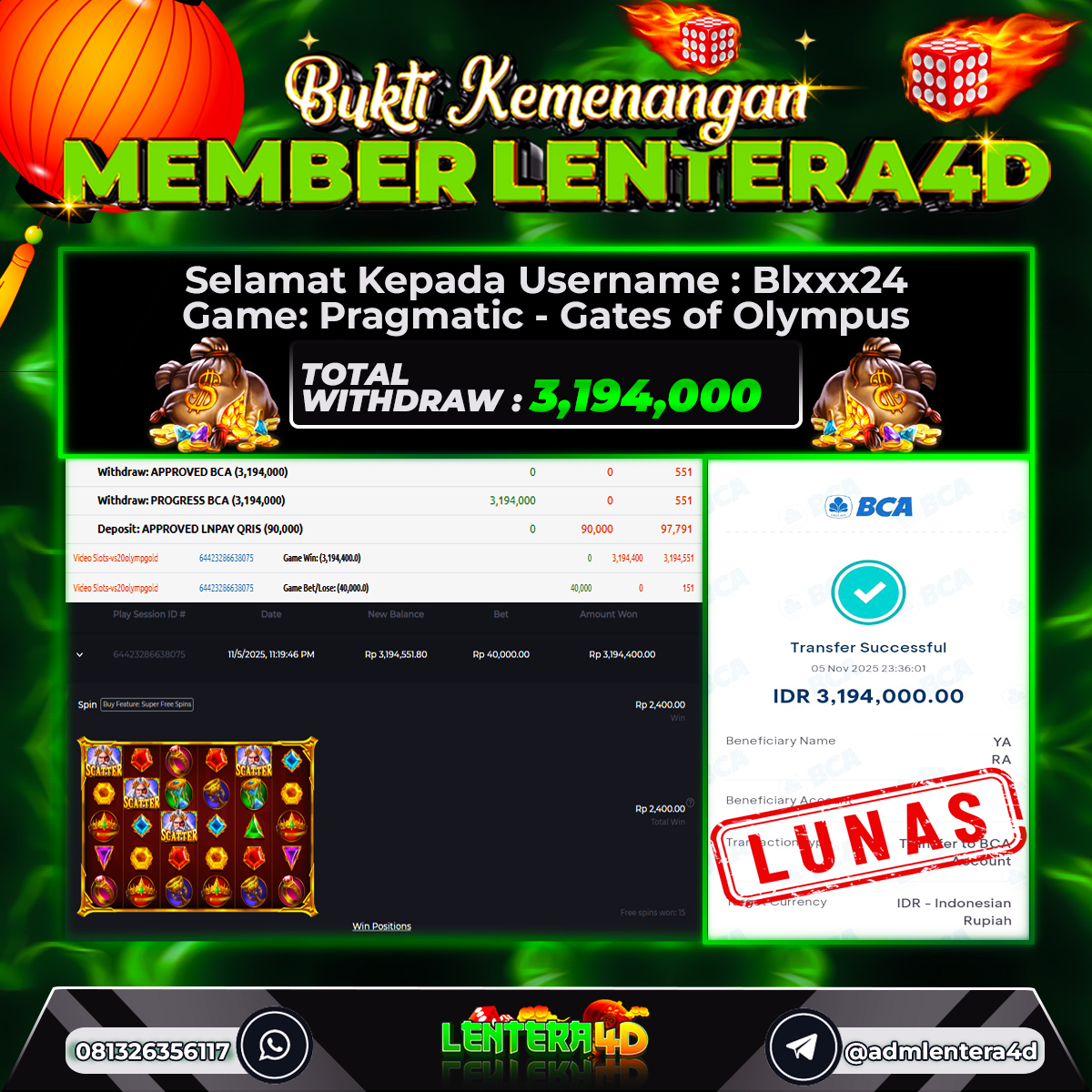 Satu lagi Bukti JP dan Pembarayan Sah Dan Dapat Dipertanggung Jawabkan, WD Berapapun Pasti Dibayar Lunas Hanya di Situs LENTERA 4D. Hati Hati Kepada Pihak Pihak Yang Mengatas namakan Pihak LENTERA4D Untuk Melakukan Penipuan.