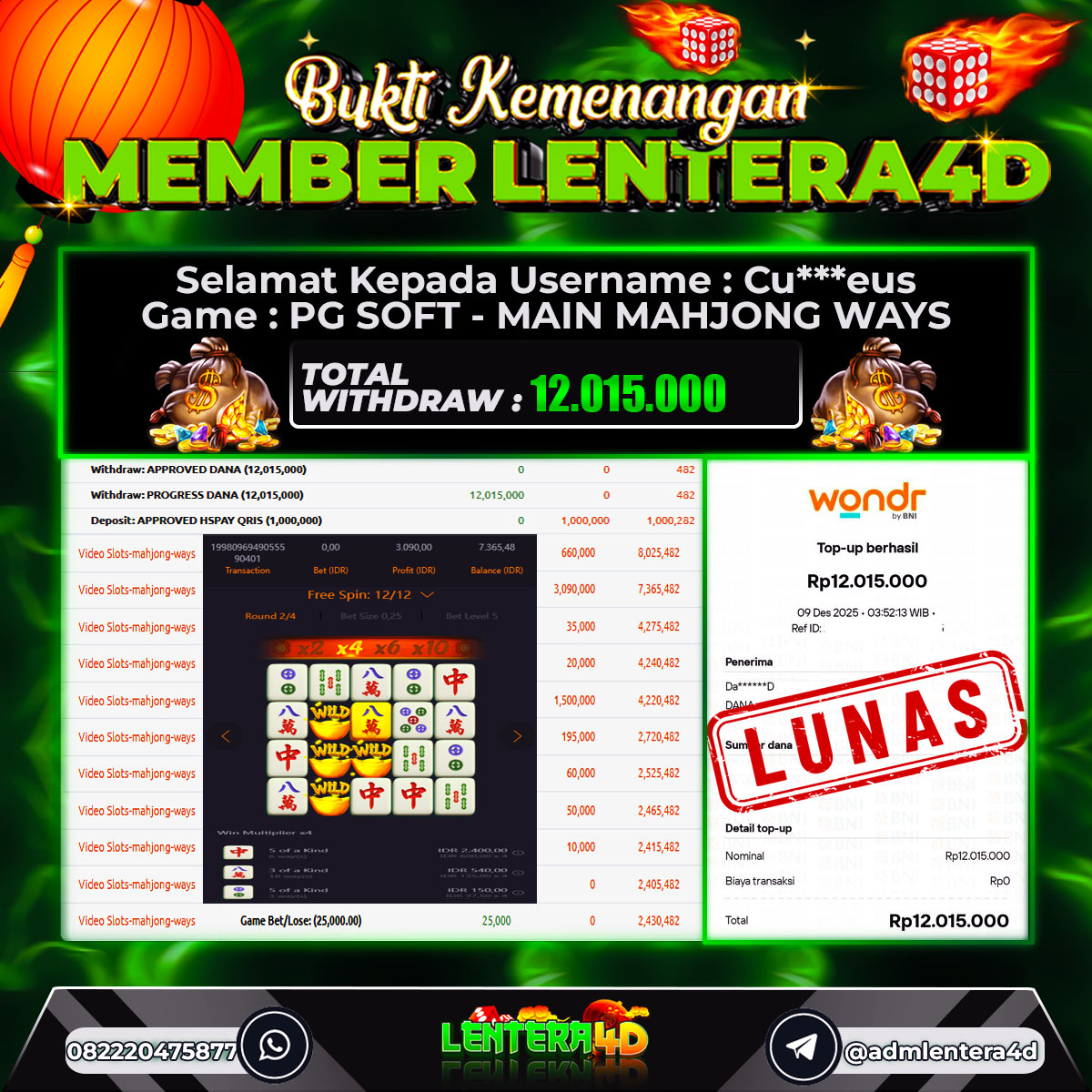 JACKPOT MAIN MAHJONG WAYS 09 DESEMBER 2025, Jackpot Slot Gacor, Kemenangan Slot, Bukti Kemenangan Slot, Kemenangan Slot PG SOFT, Menang Slot online, Slot Gacor, Situs Aman Terpercaya, WD Berapapun Pasti DI Bayar Tuntas, Maxwin Slot Online.