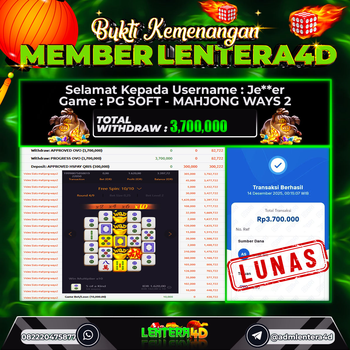 TOTAL KEMENANGAN : Rp. 3,700,000,-