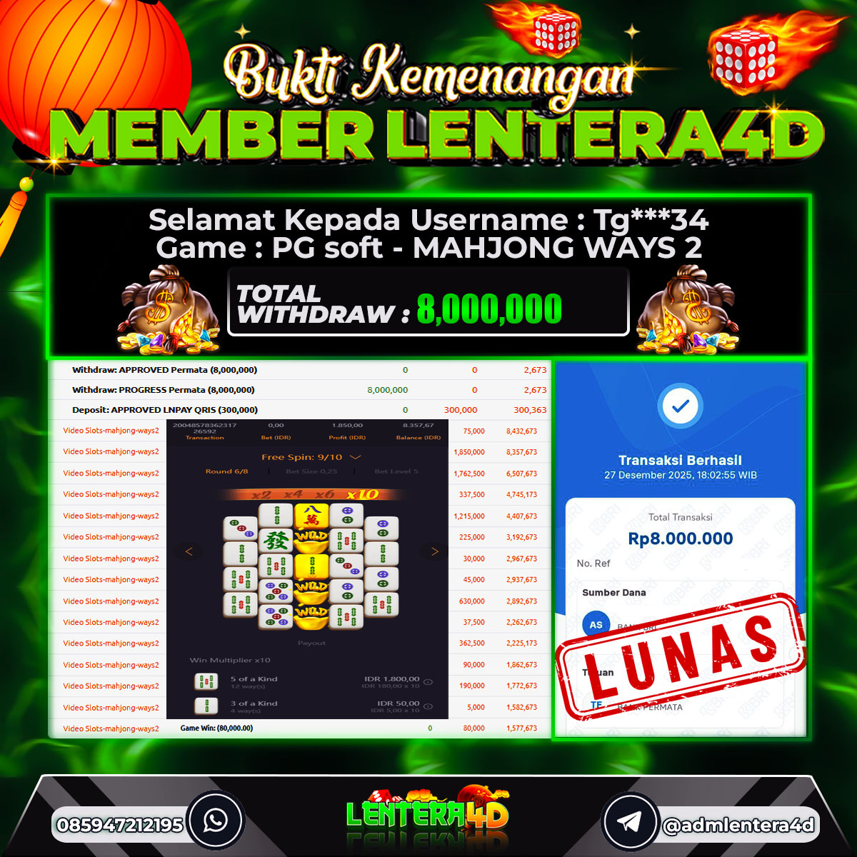 TOTAL KEMENANGAN : Rp. 8,000,000,-