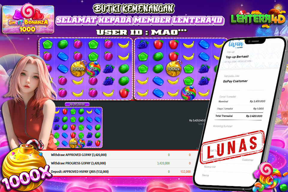 Setiap hari, member Lentera4D berhasil meraih jackpot besar dari berbagai provider slot ternama yang kami sediakan, seperti Pragmatic Play, Habanero, PG Soft, dan masih banyak lagi. Kami secara rutin menampilkan bukti screenshot atau rekapan kemenangan yang berhasil diraih, mulai dari kemenangan ratusan ribu hingga puluhan juta rupiah. Semua slip kemenangan ini kami hadirkan untuk membuktikan bahwa di Lentera4D, peluang menang itu nyata.
