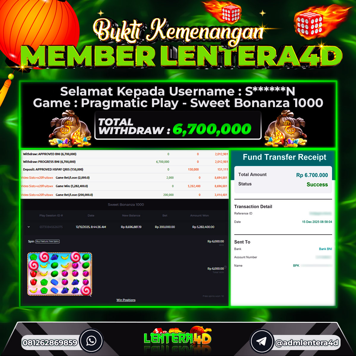 JACKPOT SWEET BONANZA 1000 15 DESEMBER 2025, Jackpot Slot Gacor, Kemenangan Slot, Bukti Kemenangan Slot, Kemenangan Slot PRAGMATIC PLAY, Menang Slot online, Slot Gacor, Situs Aman Terpercaya, WD Berapapun Pasti DI Bayar Tuntas, Maxwin Slot Online.